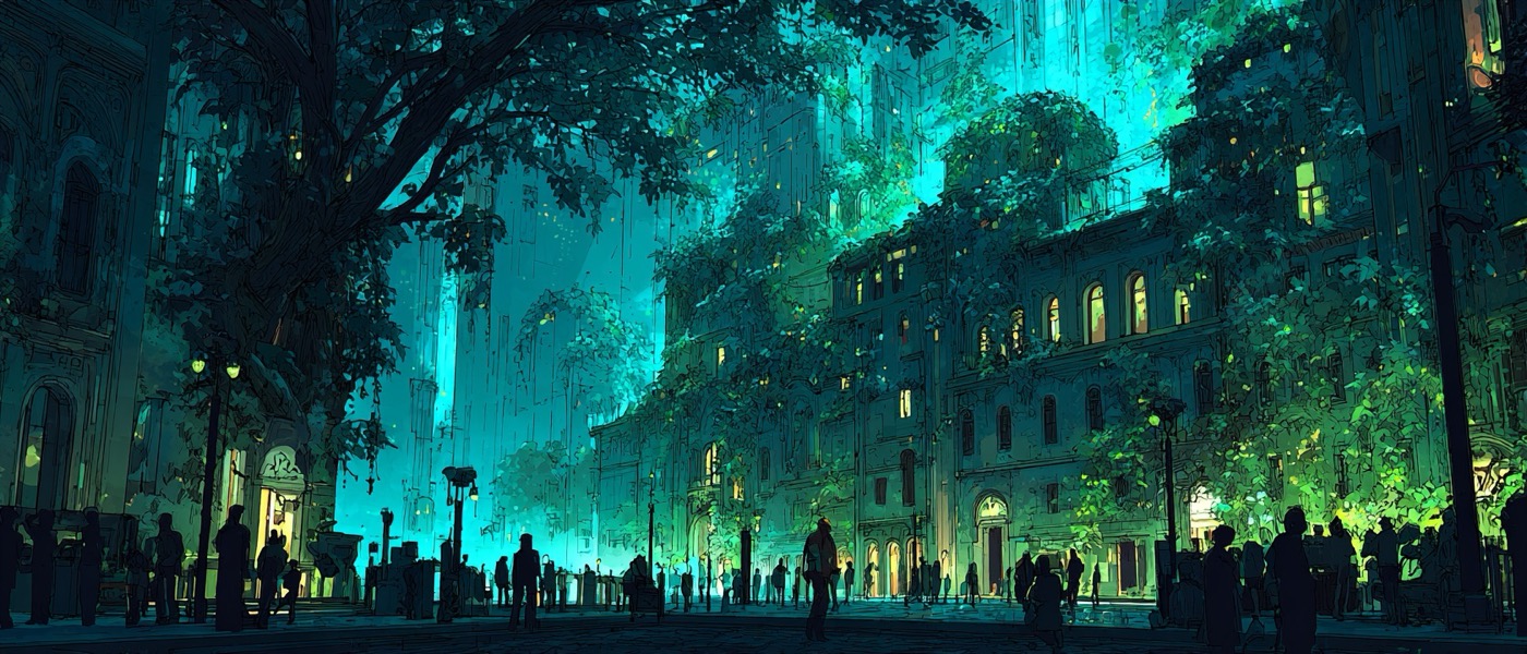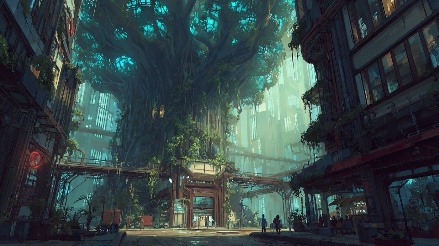 Genomia respire lumiere et vit a travers ses materiaux. Six anneaux concentriques autour d'un Arbre-Monde, ou la distance au centre mesure la vie comme la mort.